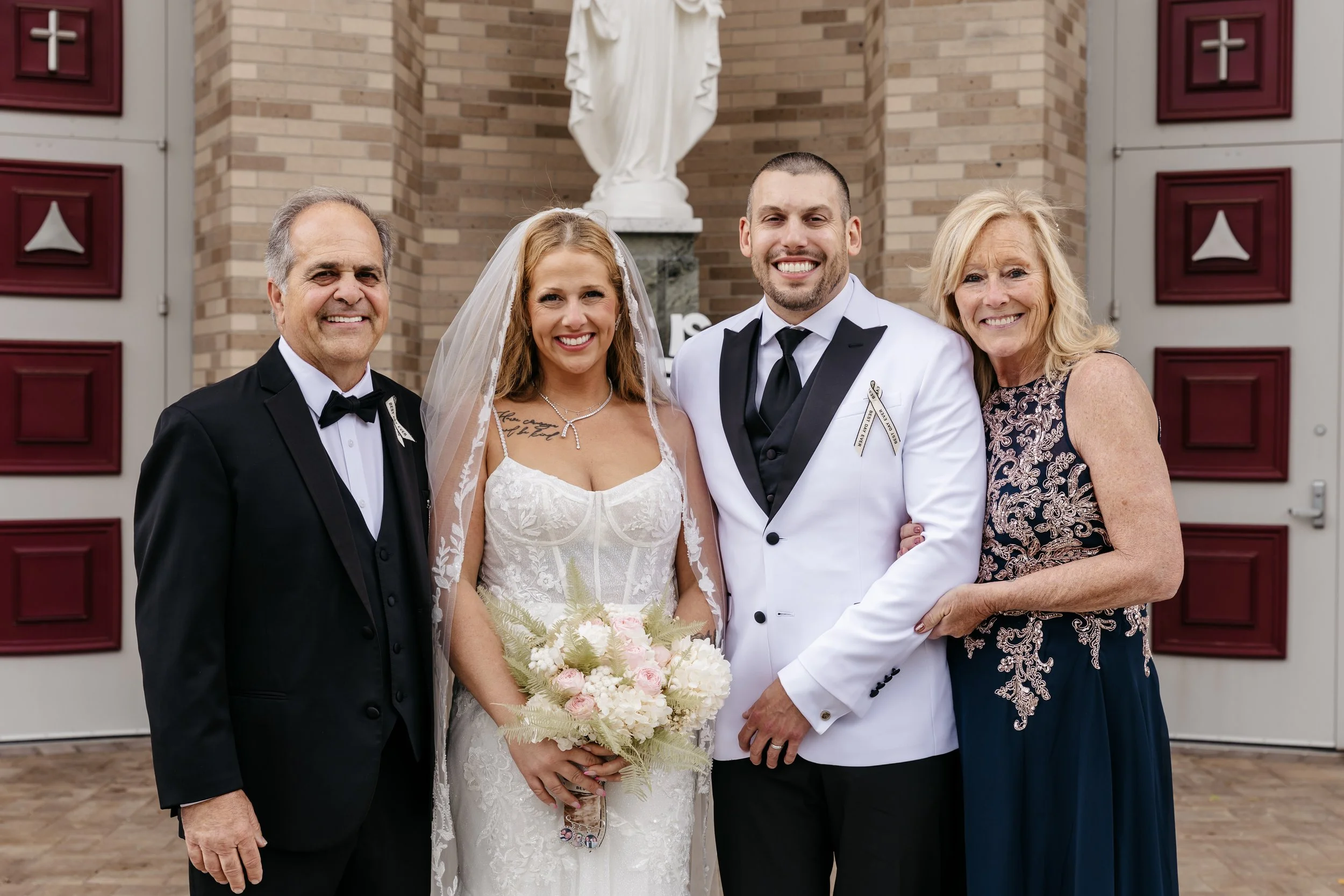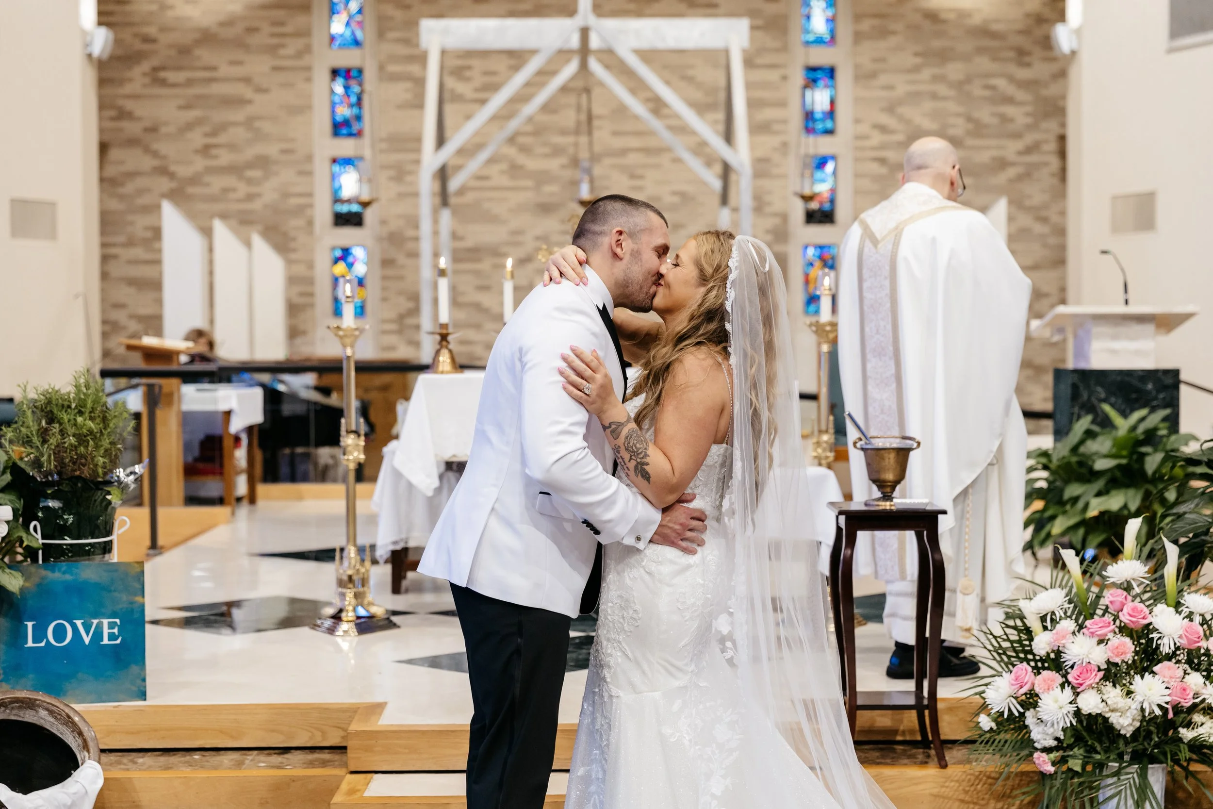Our day began with Kim staying and getting ready at the hotel, and Dan was home in our apartment getting ready. Dawn and Lyle came to pick up their future son-in-law and drove him to the church, which was before Kim arrived. A driver came to pick Kim up in a Rolls Royce Dawn at the hotel, and drove her to Our Lady of Mercy for 11:00am ceremony time. Both of us felt calm, cool and collected the entire wedding day, and we were just so excited to be married to each other.
